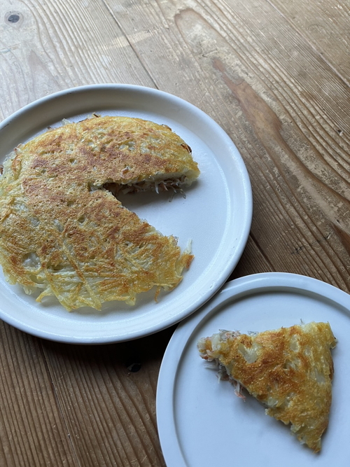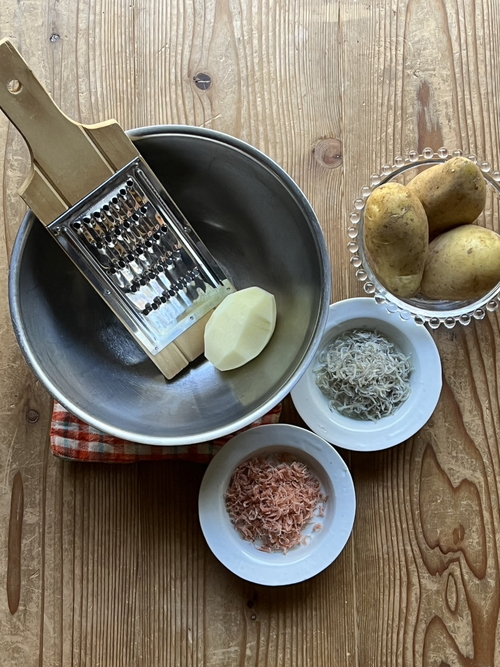 「ガレット」はフランスブルターニュ地方の郷土料理で、平たくて丸いもの、という意味。ジャガイモだけで作るのも良し、チーズやベーコンなど塩気のあるものを挟むのも良し。今回はちりめんじゃことエビちりめんを使ってちょっと和風にアレンジしました。カルシウムも取れて栄養満点!