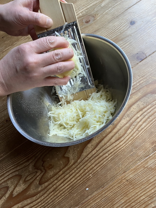 ジャガイモがだんだん小さくなってきたら力加減に注意して!力を入れすぎると指や爪がザックリ…(怖)。最後は無理せず包丁で千切りしましょう。