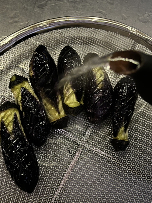③小茄子を素揚げする。