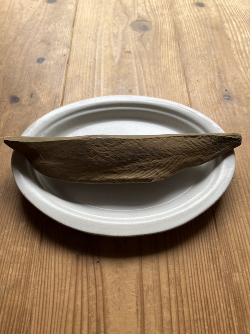鰹節は必ず頭から削ります。写真の鰹節は左側が頭なのでそちらから削ります。そうすると 身の繊維に沿って削れるのでキレイな鰹節ができますよ。試しに右側の尾っぽから削ってみるとクズクズに。 削った断面も全く違うでしょ?初めて削る人はここ、ポイントです。